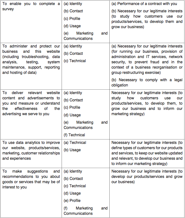 Note that we may process your personal data for more than one lawful ground depending on the specific purpose for which we are using your data. Please contact us if you need details about the specific legal ground we are relying on to process your personal data where more than one ground has been set out in the table below.